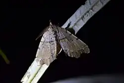 The egg of this species usually hatches after approximately three weeks.[15] Larvae of this species are active during spring and summer.[12] This species pupates on the soil amongst leaf litter and moss forming a thin cocoon in which to do so.[13][15] Adults are on the wing throughout the year but are most common from September to March.[13] They are active from dusk and are attracted to light.[13][16] During the day adult moths can be observed resting on dead fern fronds and at night have been observed feeding on the blossoms of Metrosideros perforata.[12]