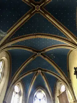The chapel interior consists of three parts. The covered entry hall separates the main atrium from the entrance portal. The interior is lit by a single window with a segmented vault and ribbed vaults in the vestibule area. A holy water font (aspersorium) is located at the entrance to the main atrium. A painted ceiling dominates the interior – it is decorated as a night sky (a European rarity). This is further enhanced by the ribbed vaults that add extra depth to the space. The ribs join in a console with a polygonal head, there is no supporting pillar. The keystone at the crossing of the ribs is decorated with floral ornament. The tall broken arch windows are glazed with colourful stained-glass panes.