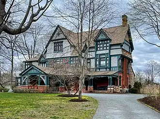 The house is a 2+12-story wood-frame structure, finished on the exterior in brick, clapboards, and shingles. It was designed by William Appleton Potter and Robert Anderson and built in 1877–78, and is an excellent example of a transitional style between the Queen Anne and Shingle styles. The building features the asymmetrical and busy massing, with many gables, an extended porch with turned columns, and brick chimneys with decorative tops. The house was built for United States Navy Admiral Charles H. Baldwin as a summer house.[2]