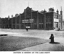 Battery D Armory stood on the east side of Michigan Avenue at Monroe Street. The building was used for various purposes, and "It appears that it occasionally required some pretty quick work to put the building into suitable condition for the morning art classes, after [the building] had been used the night before for a boxing match or a ball."[29] It was demolished in 1896.