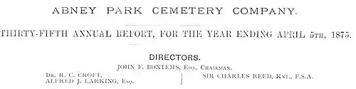 Reed, with a firm understanding of the historical importance of the landscape and its educational value, won election as a director of the company for 16 years between 1866 and 1881 and became a principal influence during its last decades as a joint stock company. Reed himself is buried there. Soon after Reed died, the cemetery was made over on 11 April 1882 to a new company run on commercial lines. This laid out a new cemetery, Chingford Mount Cemetery in 1883–1884. Others at Hendon Park and Greenford followed.[13]
