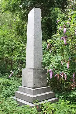 He is buried at Abney Park Cemetery near the Church Street (southern) entrance, in a grave marked by a grey granite obelisk.[17] The top is missing from the obelisk. His wife, Margaret (1817–1891), and eldest son, Charles Edward Baines Reed (killed accidentally in 1884), lie with him. His second son, Andrew Holmes Reed, lies nearby to the south, beneath a large grey granite Celtic cross.