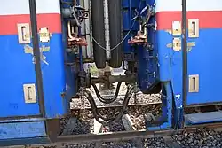 The locomotive has two sets of bogies, each with two axles in the Bo-Bo layout.[14] As the locomotive is based on the basic structure of the SS8, the bogies are also largely similar. The bogies use Low Alloy High Tensile steel. The suspension between the wheels and the bogie frame are soil springs with vertical dampers; the suspension between the bogie and the locomotive are flexible coil springs with vertical, yaw and horizontal damping. The wheels are driven by six elastic shafts connecting the frame supported motor, driven with a gearbox on each side.[1]