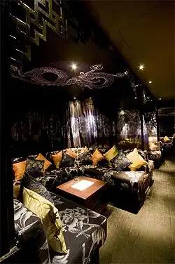 The original club in Soho had a number of "suites" with soft, bed-like lounging areas. including a "VIP suite" which gained notoriety in the British press over the years.[11] The Unofficial Guide to London described the club as "highly artistic and colourful", and noted the "oriental styles and Chinese daybeds mixed with theatrical flair [and] unique lighting and cushions everywhere".[12]