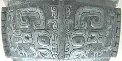 The taotie pattern was a popular bronze-ware decorative design in the Shang and Zhou dynasties, named by scholars of the Song dynasty (960–1279) after a monster on Zhou ding vessels with a head but no body mentioned in Master Lü's Spring and Autumn Annals (239 BC).[15]
