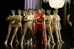 The video begins with a shot of Minogue posing in a dark room, dressed in a sparkling costume on which rainbow-lighting is projected. She is then shown in front of a wall wearing a flowing maroon dress. As the intro ends and the first verse commences, Minogue appears in a hall and performs various dance routine with numerous female dancers clad in nude bodysuits. The singer's attire consists of a pleated red organza dress designed by Austrian fashion designer Helmut Lang (in 2006, Minogue donated this costume to the Arts Centre Melbourne museum, where it is displayed in the Kylie Minogue Collection).[19] Shots of the dancers in kaleidoscopic arrangements are intercut. A few seconds later, Minogue and a man dance together alone in a hall. Their dance ends with the man slowly laying Minogue down on the floor and leaving. Twelve women in golden and pastel pink dresses are seen dancing on a dark brown floor, which is revealed to be Minogue's hat as the camera pans out. She proceeds to wave to a distant person and then plucks the petals out of a pink rose she is holding. The rest of the video randomly intersperses all of the previous scenes.[22] Complimenting the video's cinematography, arts and music writer Lesley Chow described it as "a deliriously romantic vision of surrender", adding: "Shadforth's depiction of warm bodies in a sensual world must be one of the most compelling realisations of the female gaze on film."[13]