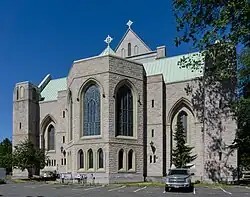 The temporary wooden east wall had become unsound. In 1985, completion of the design with central tower was abandoned, and a design for a worthy completion in the spirit of the original was adopted, a stone-clad addition containing a chapel, vestries, chapter room, and wash rooms. It was expected that the addition might exist with simple sheet metal cladding for many years before stone cladding could be afforded, but several unexpected large bequests came along, which allowed the project to be completed immediately, and removed all construction debt. The exterior was, however, finished not on stone, but in concrete masonry and EIFS. Birds of the precinct have found EIFS to be an ideal substrate for nest cavity construction.