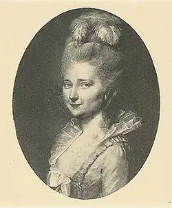 She is described as the female courtier perhaps most favored by the queen and almost always in her company at card games, masked balls and outings, a friendship that was established at least from 1767 onward.[2] In 1770, she accompanied the king and queen upon their tour through the Duchies, during which she corresponded with her spouse.[3] At that trip, she accompanied the queen in the informal dinners and outings she enjoyed with Struensee and their closest friends.[4] In 1771, she was given the order of the queen because of their close friendship. She was also present with the queen at Hirschholm Palace during the summer of 1771.