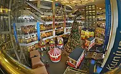 In regions with a Christian majority, both Protestants and Catholics celebrate Christmas with ceremonies and local food.[4] In big cities, shopping centers are decorated with plastic Christmas trees and Santa Claus figures (locally known as Sinterklas, derived from the Dutch word Sinterklaas). Many local television channels broadcast Christmas musical concerts, and the government organizes the annual national Christmas celebration. In addition to traditional foods, there are also unique Christmas Day foods, such as traditional desserts like nastar (pineapple tart) and kastengel (from Dutch word kaasstengel), or 'putri salju'.[5]