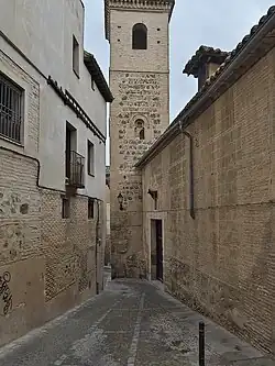 The oldest part of the church is the tower, now incorporated in the nave of the Gospel, but originally external. Its medieval condition was exposed during a restoration campaign in 1940. It is modeled directly from a Muslim minaret, as in the Church of Santiago, Toledo with which it has obvious similarities: