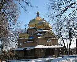 Church of the Entry into Jerusalem (Ukrainian: Церква В'їзду Господа в Єрусалим) is a Greek Catholic parish church (UGCC) in Staryi Uhryniv of the Novytsia rural hromada, Kalush Raion, Ivano-Frankivsk Oblast, Ukraine and an architectural monument of local importance.[2] In a former wooden church on the site, Stepan Bandera was baptized.[3]