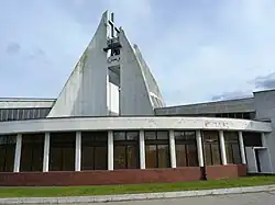 The rectory was first built in 1977. On April 15, 1978, the cornerstone of the future church was laid: the ceremony led by the Primate of Poland Stefan Wyszyński was attended by 30,000 inhabitants.[3] The stone block comes from the foundations of the cathedral in Gniezno. It is still visible nowadays, embedded in the eastern wall between the church and the Chapel of the Memory.[5]