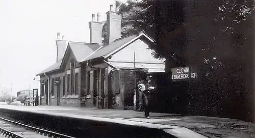On 4 July 1938 the station was renamed "Clown and Barlborough", then renamed again by British Railways (BR) on 18 June 1951, this time by adding a "e" to become "Clowne and Barlborough."[10] BR went to this trouble to seek to distinguish the station from its neighbour, a mere 30 yards (27 m) to the south, the ex-LD&ECR station which it renamed Clowne South.[11][12]