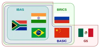 South Africa: BASIC, BRICS, G5 and IBSAThe temporary collaboration of two or more separate parties with a set goal and common purpose can be viewed as a coalition in international relations.[13] Coalition competitions are represented in international political dynamics.[14] A coalition can be an ad hoc grouping of nations united for specific purposes.[15] Although persons and groups form coalitions for many and varied reasons, the most common purpose is to combat a common threat or to take advantage of a certain opportunity, resulting in the often temporary nature of coalitions. The common threat or existence of opportunity is what gives rise to the coalition and allows it to exist as all parties involved see the benefit in working together. Such collaborative processes allow the actors of the coalition to approach a common goal or accomplish the same task.[16] The behavior and dynamics of coalitions in international relations are created by commonalities and differences within the groups joining together. Rationality, group dynamics, and gender are all contributing factors of coalitional behaviors in an international security framework.[17]