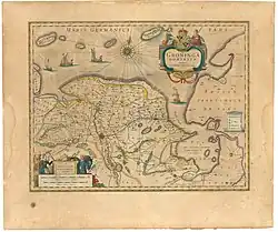 Map of the domain of Groningen in the Theatrum Orbis Terrarum, sive, Atlas Novus (1645) with the shield of the province of Groningen above the map title