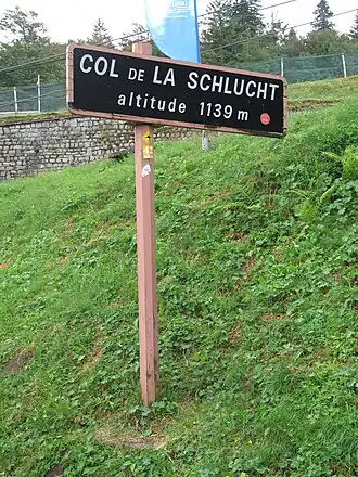 The Col de la Schlucht (French pronunciation: [kɔl la ʃluxt] ; elevation 1,139 m (3,737 ft)) is a mountain pass in the Vosges Mountains of France. On the west side lies the historical region of Lorraine (Lothringen in German),[2] on the east side lies the historical region of Alsace (Elsass in German).[3]
