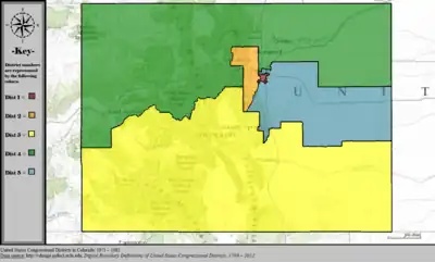 Table of United States congressional district boundary maps in the state of Colorado, presented chronologically.[7] All redistricting events that took place in Colorado between 1973 and 2013 are shown.