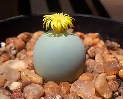 Rounded ball-shaped succulent plant, that divides to form dense clumps. The resemblance to pebbles and the firmness of its flesh is what got it its name ("calculus" is Latin for "pebble"). It produces yellow or orange flowers in autumn, that open at night, and have the aroma of cloves.
