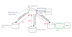 In primary-based local-write protocols,[4] primary copy moves between processes willing to perform an update. To update a data item, a process first moves it to its location. As a result, in this approach, successive write operations can be performed locally while each process can read their local copy of data items. After the primary finishes its update, the update is forwarded to other replicas and all perform the update locally. This non-blocking approach can lead to an improvement. The diagram of the local-write protocol depicts the local-write approach in primary-based protocols. A process requests a write operation in a data item x. The current server is considered as the new primary for a data item x. The write operation is performed and when the request is finished, the primary sends an update request to other backup servers. Each backup sends an acknowledgment to the primary after finishing the update operation.