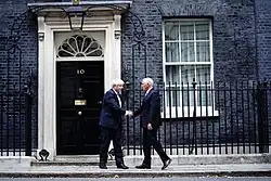 The prime minister, at 10 Downing Street, exercises political power of the British government, when they command majority support of the House of Commons.