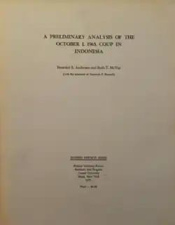 A Preliminary Analysis of the October 1, 1965, Coup in Indonesia, more commonly known as the "Cornell Paper", is an academic publication detailing the events of an abortive coup d'état attempt[1] by the self-proclaimed September 30 Movement, produced on January 10, 1966. The study was written by Benedict Anderson and Ruth McVey, with the help of Frederick Bunnell, using information from various Indonesian news sources. At the time of writing, the three were members of Cornell University's network of graduate students and scholars on Southeast Asia.