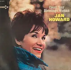 Count Your Blessings, Woman is a studio album by American country music artist Jan Howard. It was released in June 1968 via Decca Records and contained 11 tracks. Many of the album's tracks were cover tunes with the exception of the title track. Released as a single, the title track was a top 20 US country song and a top ten Canadian country song. The album itself made the top 30 of the US country survey. Howard's vocal performance was praised in reviews by Billboard and Cash Box magazines.