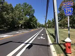 CR 579 begins at an intersection with Route 29 in Trenton, Mercer County, heading north on two-lane undivided Sullivan Way. The road crosses under the Delaware and Raritan Canal and an abandoned railroad, making a turn to the northwest. The route passes between the Trenton Country Club to the southwest and the Trenton Psychiatric Hospital to the northeast as it enters Ewing Township. CR 579 enters and crosses CR 643, heading into wooded areas as it passes the Katzenbach School for the Deaf. The route passes under a railroad line that is part of CSX's Trenton Subdivision and SEPTA's West Trenton Line southwest of the West Trenton station that serves as the terminus of the SEPTA line, at which point it becomes Grand Avenue and passes through the residential community of West Trenton. CR 579 crosses CR 634, becoming Bear Tavern Road, and turns northwest as it passes near Trenton-Mercer Airport, intersecting CR 600. The route interchanges with Interstate 295 (I-295) and heads into wooded residential areas, intersecting CR 647 before joining CR 637 on Jacobs Creek Road. Here, the road enters forested areas and crosses the Jacobs Creek into Hopewell Township, heading north. CR 579 splits from CR 637 and continues northwest onto Bear Tavern Road, crossing the Jacobs Creek again and turning north into a mix of fields, woods, and homes. The route crosses CR 546 and continues through farmland and woodland with a few residences. The route becomes Harbourton-Rocktown Road and comes to a junction with CR 623 before passing through more forested areas and coming to the CR 518 intersection.[1][2]