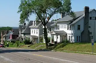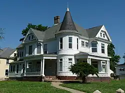 Court Street was developed as a major artery from the Des Moines River to Sixth Street, which was Ottumwa's original city limits, where it made a slight turn to the north and headed up a bluff and into the countryside above the river valley. It is possible that it is the road established by the Iowa Territorial Legislature in 1844 that extended from the southern Davis County border to the northern Wapello County border and connected the two county seats.[2] Later it was signed as U.S. Highway 63. The oldest houses in the district were built between 1865 and 1875. The first electric streetcar began operating on Court Street in 1889. The street was paved with bricks in 1890 and 1891. Both projects led to increased development of the area between 1890 and 1915. From this period until 1942, a centralized steam heat system was available in the city and the main pipes were located under Court Street. Because of this, the street was never covered with snow or ice during the winter and people could always climb to the top of the bluff when other streets were impassable.[2] During the World War II years, many of the large homes were divided into multi-family dwellings. That process started to be reversed in the late 20th century when historic preservation took root in Ottumwa.[2]: 30