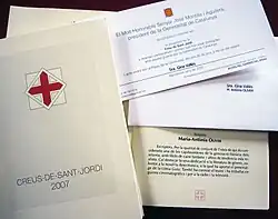 The Creu de Sant Jordi (Catalan pronunciation: [ˈkɾɛw ðə ˈsaɲ ˈʒɔɾði], in English 'St George's Cross') is one of the highest civil distinctions awarded in Catalonia (Spain), surpassed only in protocol by the Gold Medal of the Generalitat de Catalunya. It was established by the Generalitat de Catalunya autonomous government by virtue of the Decret 457/1981 de 18 de desembre in 1981.[1] The medal was designed by goldsmith Joaquim Capdevila.