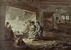 “Inside a cottage in Glamorgan”, a watercolour by Julius Caesar Ibbetson, 1792, showing a living room in a stone-built longhouse with the stable adjacent occupied by a Glamorgan cow. There is a loaf of bread and a piece of cheese on the table, a wooden tub on the floor, probably for milk, and a ham hanging from the ceiling
