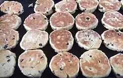 Tibbott mentions recipes for Bakestone Cake (Teisen Lechwan), Bakestone Pie (Teisen ar y Maen) and Bakestone Turnover (Teisen ar y Maen). The dough for Bakestone Turnover and Bakestone Cake is prepared in the same way, although the former uses less fat and sugar. The butter and lard are added to flour, sugar and currants and then beaten eggs and some milk are added to make a soft dough. In the case of a Bakestone Cake, this is rolled out on to a floured board and cut into small rounds which are baked on a bakestone. In the case of a Bakestone Turnover the dough is rolled out to the size of a dinner plate half of which is covered with fruit, such as sliced apple, blackberries or gooseberries. The other half is folded over the fruit and the edges are pressed together and sealed. The pie is also baked on a hot bakestone and the top layer of the pie is split open to add sugar and then re-covered. Tibbott mentions that the Bakestone Turnover was prepared on farms during harvest time.[49]