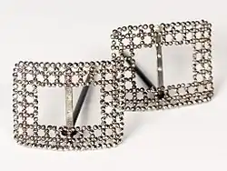 It has been suggested that cut steel jewellery dates back as far as the 16th century.[2] This is based on a single reference from 1598 and it is far from clear if it is talking about steel at all.[2] Less ambiguous evidence shows that from around 1720 cut steel was manufactured in Woodstock, Oxfordshire.[2] Exactly what was manufactured is poorly documented but by 1761 it included worn items such as buckles and watch chains as well as scissors.[2] Exactly when purely decorative items first appeared is also unclear but "Stars for the nobility" are attested from 1778.[2] Production in Birmingham became common latter in the century with Matthew Boulton being a prominent producer.[6] The move away from Woodstock produced a switch from screwed studs to riveted studs.[4] While the latter approach was cheaper it meant the jewellery could no longer be fully disassembled for cleaning.[4] One of the major production items of 18th century cut steel was the shoe buckle and it is possible that the decline in the fashion for wearing buckles towards the end of the century drove the diversification of cut steel jewellery.[7]