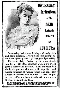 In 1908, the British Medical Journal investigated the advertising of nostrums for the treatment of skin diseases. As reported by the American Medical Association[3] it was implied that Cuticura soap could be effective in the treatment of syphilis when prepared as an internal remedy known as Cuticura Resolvent. The medical community considered the proposed remedy to contain insufficient potassium iodide to be effective in the treatment of the disease.[4]