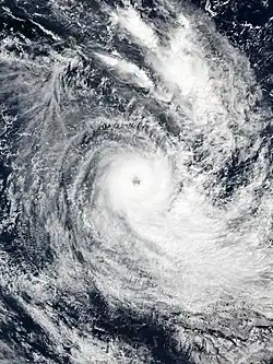 Drifting south-southwest and then south, Donna continued to struggle under the combined effects of upper-level winds and ocean upwelling.[17] By early on 7 May, however, convection within the eyewall began to increase in intensity,[18] and the FMS upgraded Donna to a Category 4 cyclone for a second time accordingly.[19] Three hours later, the JTWC estimated that it had intensified to a Category 4 equivalent, completely skipping Category 3 status.[20] With a solid ring of deep convection surrounding a well-defined 55 km (35 mi) eye,[21] the FMS upgraded Donna to a Category 5 cyclone at 00:00 UTC on 8 May, estimating that the storm possessed 10-minute sustained winds of 205 km/h (125 mph).[22] As a result, Donna became the strongest off-season tropical cyclone on record during the month of May in the South Pacific basin.[23] Weakening began shortly following peak intensity as Donna's eye became partially obscured and the eastern eyewall was eroded;[24] the storm weakened back to Category 4 intensity by 18:00 UTC on 8 May,[25] Category 1 intensity by 21:00 UTC on 9 May,[26] and ultimately degenerated into a tropical low by 06:00 UTC on 10 May as it dodged New Caledonia.[27]