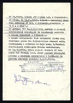 He not only served as the group's doctor but also hid the plans for Operation Krüger in the hospital's boiler room.[14] He used the pseudonym Adam S-II[15][16] and was the deputy (right-hand man) of Dr. Józef Chojnowski (Adam I).[17] The S stood for the sanitary battalion. All hospital directors had trusted deputies who were familiar with medical records in case of arrest.[18]
