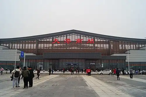 Dagang South railway station (Chinese: 大港南站; pinyin: Dàgǎng Nán zhàn) is a railway station in Jingkou District, Zhenjiang, Jiangsu, China. It opened with the remaining section of the Lianyungang–Zhenjiang high-speed railway on 11 December 2020.[1] It had been expected to open the previous month.[2]