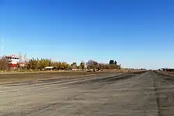 The airport is on the west side of the city. There is distant mountainous terrain east and west of the runway.