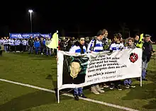 After an initially unprofessional performance of the KNVB in which the board of SC Buitenboys felt abandoned by the football association, they soon took charge.[1][21] They cancelled all amateur fixtures the weekend after Nieuwenhuizen's death, the first such cancellation since the 1973 oil crisis, and took out full-page newspaper ads reading Zonder respect geen voetbal (Without respect, no football).[1] A minute's silence was observed at professional matches, and players wore armbands.[22][23] SC Buitenboys held a silent march on 9 December in which 12,000 people took part.[1][2][7] They also organized a memorial match between former star football players and a team of SC Buitenboys, installed a permanent memorial, and announced that they would make the "Without respect, no football" slogan a binding guideline. Many clubs put up signs with the slogan.[8] The Nieuw Sloten club temporarily cancelled all football,[24] and three teams announced they would leave the club.[1][25]