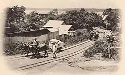 The 600 mm (1 ft 11+5⁄8 in) gauge Decauville railway was built in 1900 from Antsirane (now Antsiranana) to the Tunisian Fountain (Fontaine Tunisienne) at today's STAR factory.[1] It started at the port and ran on the Rue Gouraud and the Boulevard Bazeilles up to the Cercle Français (now Suarez Art) and up the Boulevard Militaire. It turned into the Boulevard de Sakaramy at the height of Camp Lubert, from where it led past the present town hall to l'Octroi and the Tunisian Fountain. At the end of 1900, it was extended from the Tunisian Fountain via Antanamitara and Andranomanitra to the junction of today's road to Joffreville.[2][1]