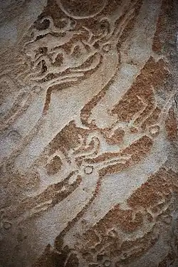 The carvings and designs were usually completed before the stone was erected, though some stones show signs of being carved in place.[2] The designs were pecked or ground into the stone surface. Deep-grooved cuts and right-angle surfaces indicate the presence of metal tools. Stone tools were used to smooth the harsh cuts of some designs.[18] Nearly all the stones were hand carved, but some unusual stones show signs that they could have been cut with a primitive type of mechanical drill.[2]