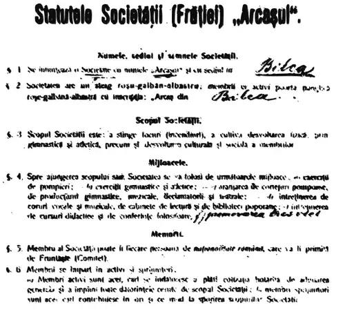 This interval in power also saw the creation of Romanian paramilitary and self-help units, called the Arcași ("Bowmen").[62] The groups were consciously modeled as a mixture of volunteer fire departments and Sokol clubs.[63] They were identified by their white shirts,[64] but also wore ribbons echoing the Romanian tricolor.[65] The first such units, also active within the temperance movement, were set up in Alt Fratautz and Parhautz.[66] Their creation signaled the Onciul and Lupu wanted to expand beyond their bourgeois constituency and actively involve the Romanian peasantry in regional politics.[67] They were often involved in skirmishes with the Ukrainian Sich clubs, "reaching out for their knives and revolvers."[63]