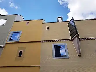 Architect Christoph Mäckler had to solve the problem of designing a building for exhibits which required protection from exposure to light,[14] while avoiding the creation of a windowless facade next to the historic Goethe House. His facade resembles three houses, each with one large window and an entrance. Behind the postmodern facade there is a straight staircase which rises up three floors, shielding the exhibition rooms behind it from daylight.[15] The stairs are called Himmelstreppe ("stairway to heaven") because they appear "endless" through an optical illusion.[16] The colour blue, symbolising the Blaue Blume of the Romantic era, dominates there and is used for other accents such as the Blauer Erker, a bay towards the street with windows of blue glass.[17] The architecture of the new building has been described as "spectacular", while the stairway to heaven has been called "a work of art in its own right".[14] The third floor offers a view of the Frankfurt skyline, making the Paulskirche, the Cathedral, and the European Central Bank appear as though they are positioned next to one another.[1] The gross floor area is 3,244 m2 (34,920 sq ft) and the effective floor area is 2,080 m2 (22,400 sq ft).[15]