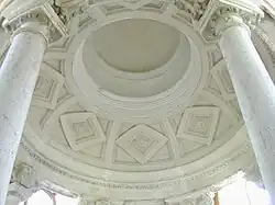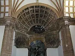 In the corners of the ceiling of the main chapel are two squinches with shell alcoves, in which the arms of the priory's patrons Rodrigo Messía and Mayor de Fonseca are depicted again, flanked by angels. Above them are two pairs of virtues: Strength and Justice over the shield of Messía, and Faith and Charity over that of Fonseca. Covering the eastern end of the chancel is a quarter-spherical vault in which an extensive iconographic scheme is represented in individual coffers, including virgin saints, martyrs of antiquity, prophets and other characters from the Old Testament, the Fathers of the Latin Church and the saints of the Order.[5] Presiding over the altar is a beautiful fresco of Saint Dominic, the order's founder, and above it the arms of the Dominican Order flanked by two greyhounds carrying torches in their jaws, the emblems of Saint Dominic.