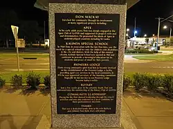 In late 2008, the Rotary Club of Griffith erected a memorial in Banna Avenue, the main street of Griffith, to honour the 30th anniversary of Mackay's murder.[17][28] The statue of Mackay itself is a white marble bust with a plaque inscribed with "All that is necessary for the triumph of evil is for good men to do nothing."