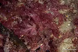 Drachiella is a genus of marine red alga.[2] It has scaly thickenings; also "rhizoids fringing openings".[3] It is found below the kelp zone in areas exposed to moderate wave action; it is iridescent, and consists of a short, narrow stipe broadening into midribless thalli which reach 7 cm in length.[4] Drachiella exhibits diffuse intercalary and marginal growth, and rhizoids are common along the margins, which it uses for anchorage.[2] Pit connections often link adjoining cells.[2]