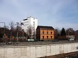 In 1894, the railway administration opened a partially contiguous railway settlement in the immediate vicinity of the station. These included five buildings on the Weißeritz at 54 to 72 Emerich-Ambros-Ufer as well as several houses on Flügelweg. These clinker brick buildings have been preserved to this day.[9] To the south of the marshalling yard, the Saxon State Railways also had a large rail workshop, which opened in November 1894, and a railway depot, which was opened at the same time as the station.