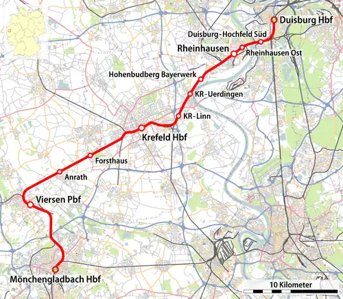 The greater part of the route, along with the western section of the Ruhr line of the Rhenish Railway Company (Rheinische Eisenbahn-Gesellschaft, RhE), forms the DuisburgMönchengladbach line, one of the main line in Germany’s lower Rhine region, connecting the stations of Duisburg and Mönchengladbach.