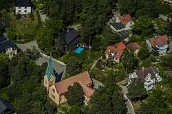 In 1899 the property Dufvebol, then in Spånga municipality, was sold to a suburb development company, which split the land and built roads, naming it Dufbo egna-hems-koloni (Duvbo own home community). After 5 years the suburb was nearly complete, housing 1200 residents.[1] From 1900 trains stopped at the nearby (400m) station Sundbyberg Norra (named so because it was in the north-west of the adjacent suburb Sundbyberg) was opened, until 1963.[2] In 1902 Duvbo became a municipalsamhälle (submunicipality), until 1949 when it transferred into Sundbyberg municipality.[1] An epidemics hospital was built in 1925 on the Ekbacken slope on the south side of Duvbo, an was torn down in the 1960s, replaced by the hospital Sundbybergs sjukhus.[3] Today Ekbacken is instead an elderly care home, next to a few tall residential buildings.
