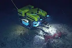 Argus is a deep-tow system capable of diving as deep as 6,000 meters (20,000 ft). Argus is typically used in tandem with Hercules, where it hovers several meters above the seafloor and provides a view of Hercules on the seafloor, but can also be used as a standalone tow sled. The frame carries a broadcast quality high definition camera, standard definition cameras, and two 1,200 Watt arc lamps capable of producing over 100,000 lumens of light each. Argus also supports a wide range of instrumentation, including a depth sensor, altimeter, CTD, sub-bottom profiler, scanning sonar, and side-scan sonar. Argus uses dual 2-horsepower (1.5 kW) electric thrusters for heading adjustment and limited lateral movement.[5][6]