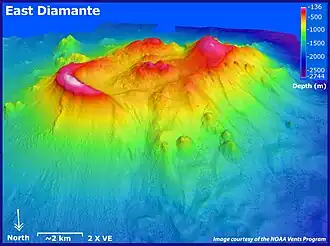 The summit of East Diamante lies 127 m (417 ft) below sea level and is truncated by an elongated, northeast–southwest-trending caldera. Formation of the caldera was followed by the emplacement of a central dome complex and the construction of a volcanic cone on the southwest caldera rim. The central dome complex displays hydrothermal activity, including black smokers.[1]